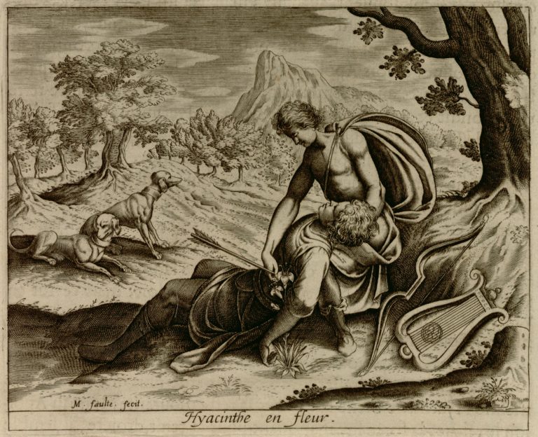 Pod stromem se Apollón sklání nad mrtvým Hyakinthem který mu leží na klíně, ruku má na šípu, kterým je Hyakinthos probodený. Z Hyakinthovy krve se stávají květy hyacintu. O svah je opřená lyra a luk, po levé straně odpočívají dva lovečtí psi.