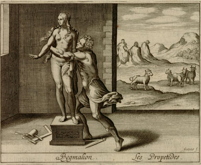 V dolní části rytý francouzský nápis Pygmalion. Les Propetides.