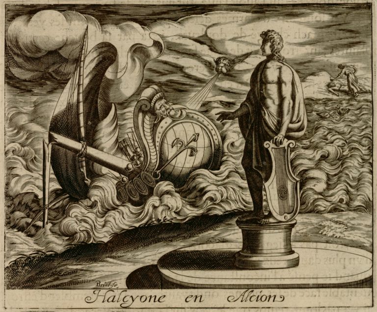 Na piedestalu v popředí stojí socha Apollóna s lyrou (věštírna v Klaru), za ní rozbouřené moře a polámaná loď. Na obloze duje personifikovaný vítr, na moři párek ledňáčků (proměnění Kéýx a Alkyóné). V pozadí na břehu se sklání Alkyóné nad mrtvým tělem Kéýka.