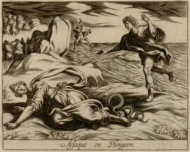 Na mořském břehu leží Hesperié, do jejího kotníku je zakousnutý had. Směrem k ní utíká Aisakos, který ji pronásledoval. Za nimi výjev, který bude následovat – Aisakos se v žalu vrhá ze skály do moře (bude proměněn v potápku).