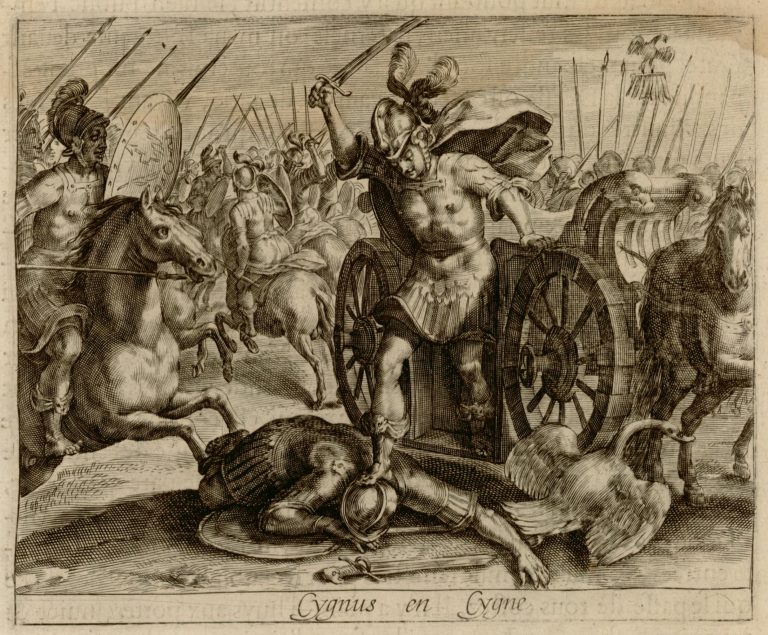 Válečná vřava trójské války: jezdci s meči, kopími a štíty na koních. V popředí stojí vozataj Achilleus s jednou nohou na hlavě těla pod sebou a chystá se setnout. Vedle těla labuť – proměněný hrdina Kyknos.