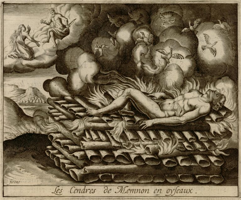 Na pohřební hranici leží mrtvý Memnón, v dýmu z popela povstávají ptáci. Vlevo v pozadí děj, kterému proměna předcházela – v oblaku klečí Memnonova matka s rozpuštěnými vlasy a prosí Dia (Iuppiter) nad ní.