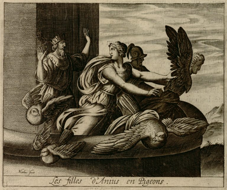V dolní části rytý francouzský nápis Les filles d‘ Anius en Pigeons.
