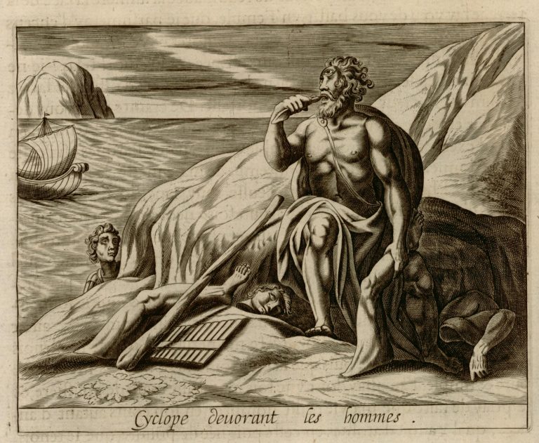 Na sicilském břehu schovaný a vyděšený Makarenus pozoruje Kyklópa, který pojídá lidské tělo. Okolo jsou části lidských těl, kyj a kus dřevěného plotu (?), po levé straně loď, na které se Makareus zachrání, dále moře a skály.