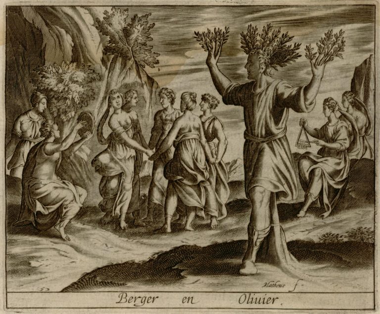 V popředí se apulský pastýř mění v divokou olivu (olea olester) – z rukou a hlavy mu raší větvičky s listy. Je to trest za oplzlost vůči vílám. Za pastýřem tančící víly – kroužek pěti víl se drží za ruce, po stranách sedí hudebnice (tamburína, triangl s kroužky), dvě víly přihlíží, okolo krajina se skálami a keři.