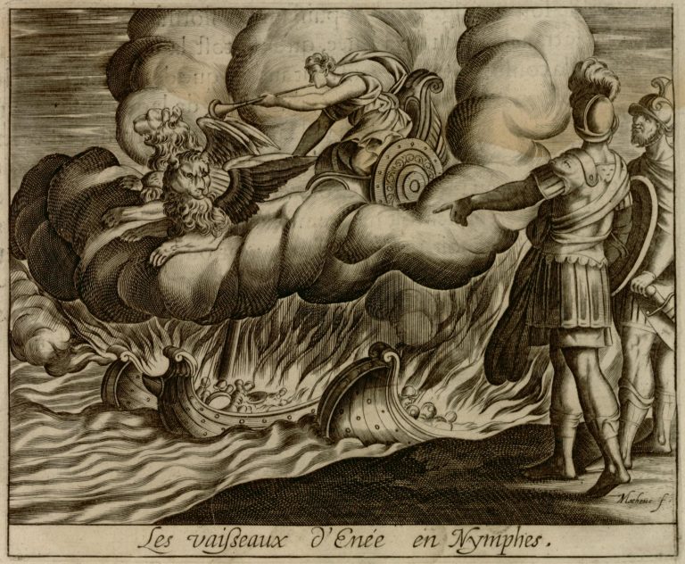 V dolní části rytý francouzský nápis Les vaisseaux d’Enée en Nymphes.