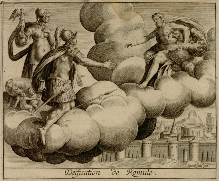 V oblacích přijímá Zeus (Iuppiter) s orlem mezi bohy klečícího Romula, vedle něj stojí Athéna (Minerva) a drží sošku Níké (Viktoria) s vavřínovým věncem, u nohou má vlčici chránící malého Romula a Rema. Pod oblaky je Řím.