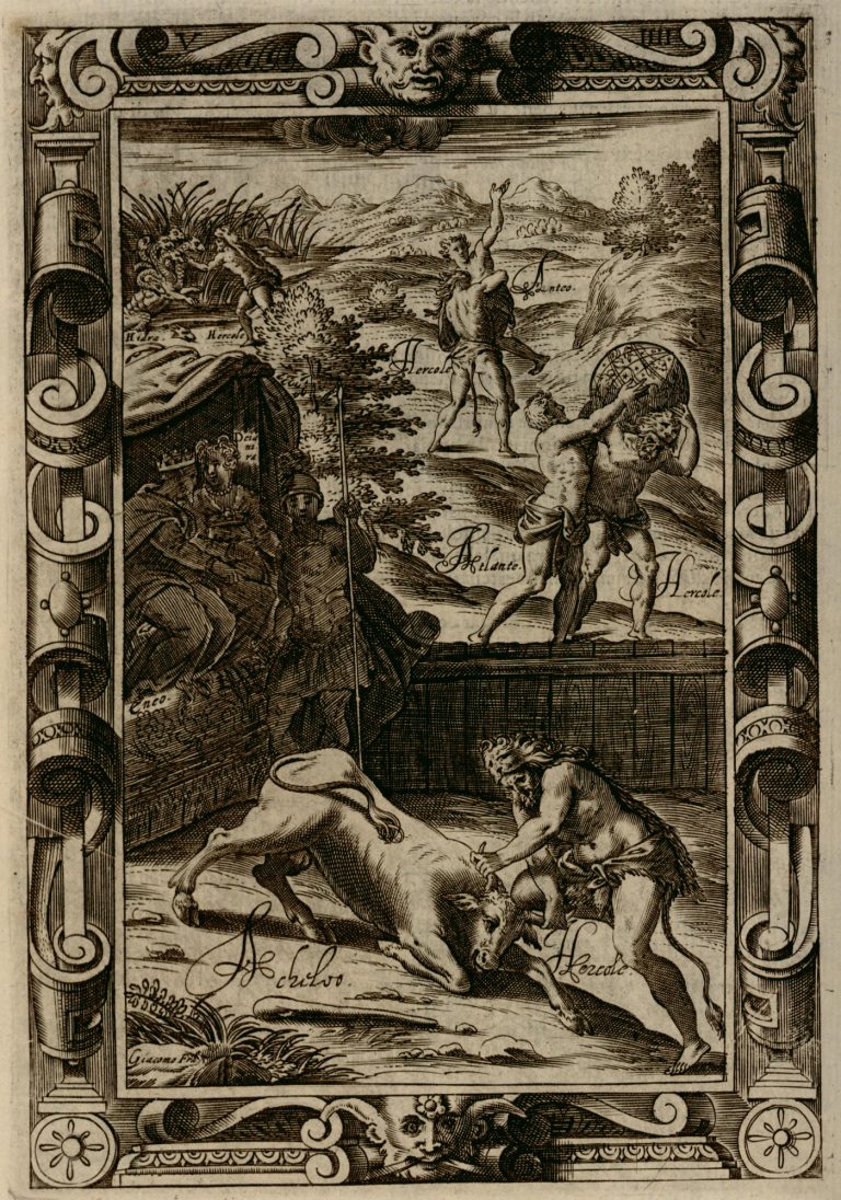 - v popředí souboj Héraklea (Hercules) a říčního boha Achelóa, který má podobu býka a Héraklés ho drží za rohy