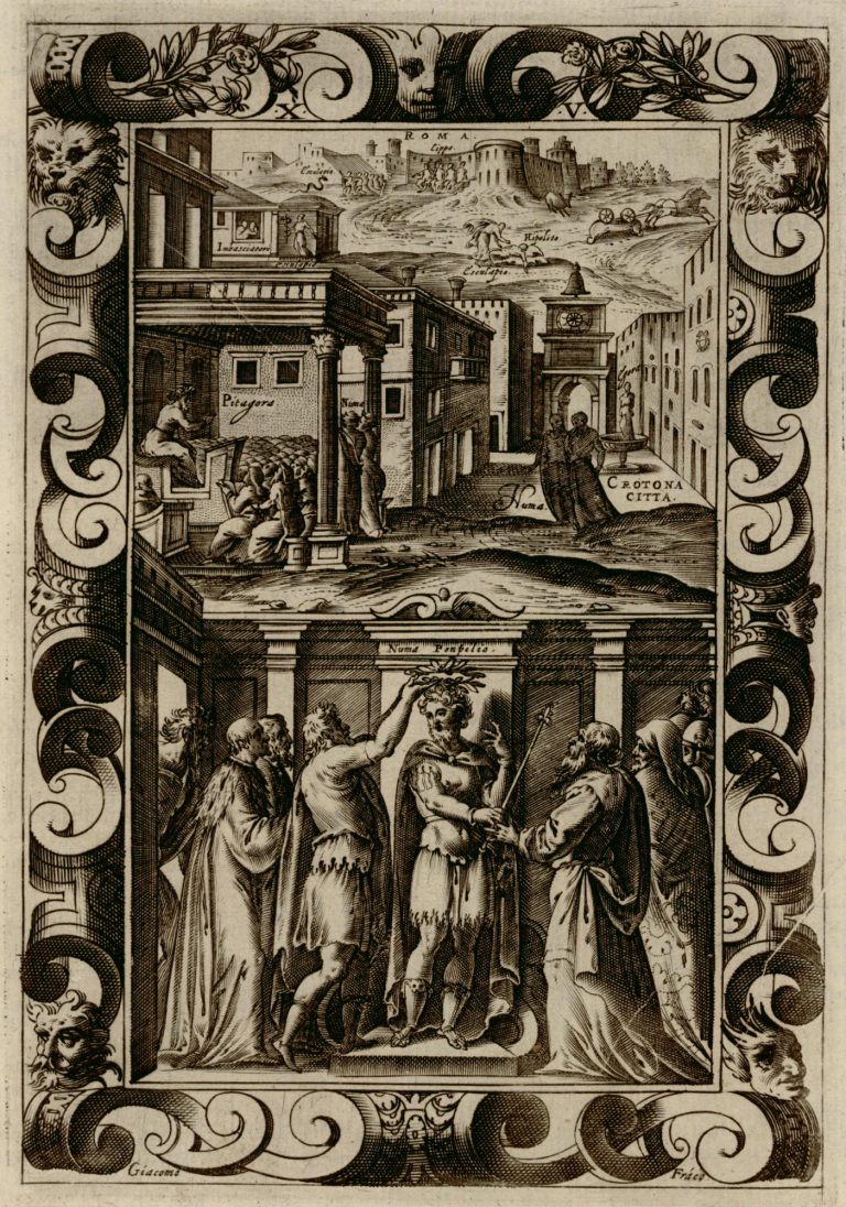 - ve střední části rytiny Numa Pompilius v Crotoně (Krotón), naslouchá přednášejícímu Pýthagorovi