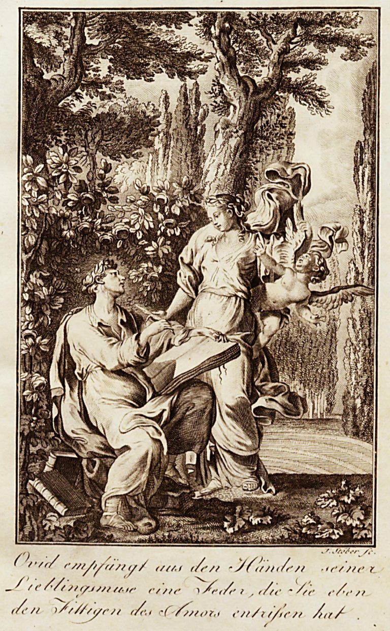 Pod rytinou rytý vysvětlující nápis v němčině Ovid empfängt aud den Händen seiner Lieblingsmuse eine Feder, die Sie eben den Fittigen des Amors entrissen hat.