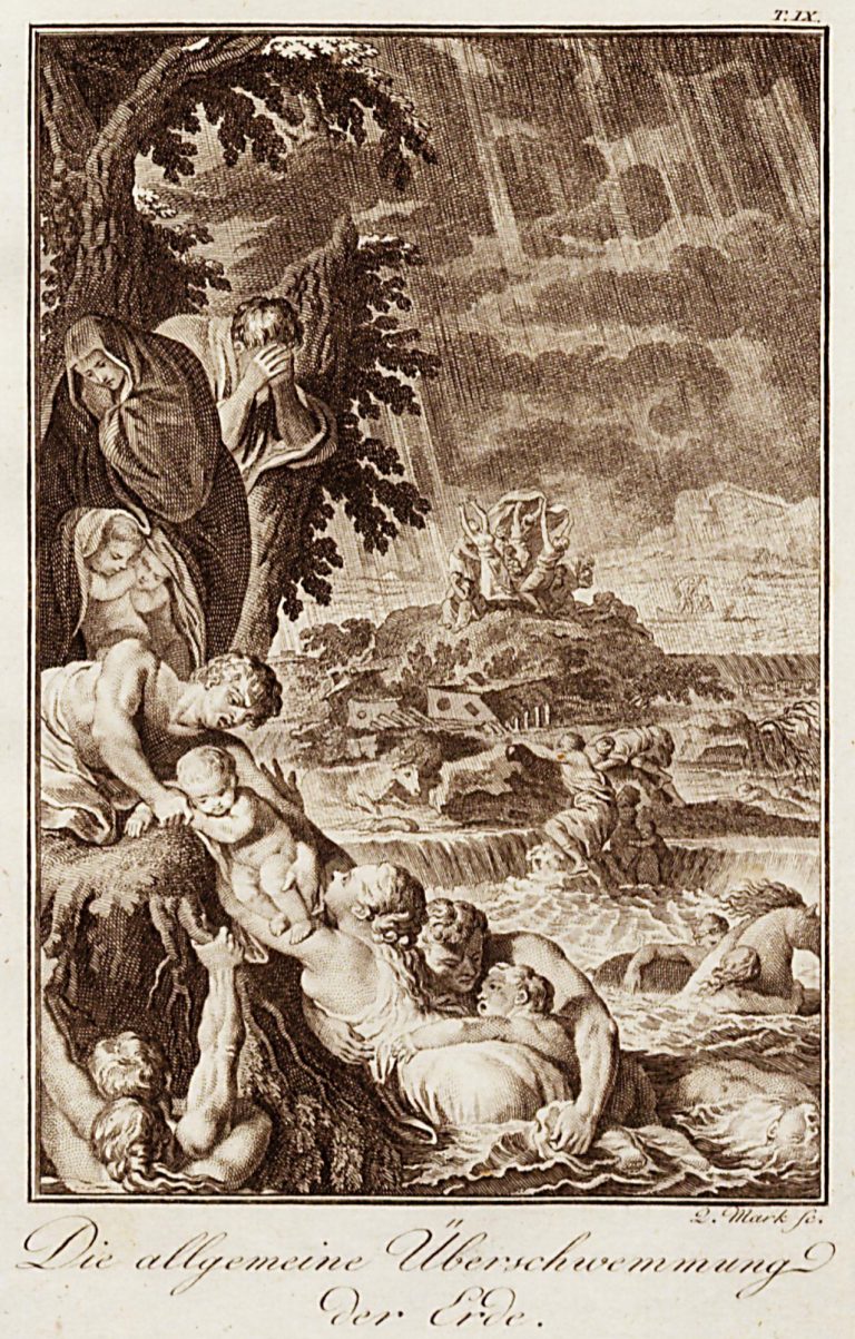 Pod rytinou vysvětlující německý text Die algemeine Überschwemmung der Erde., v horní pravé části označení přílohy T. IX.