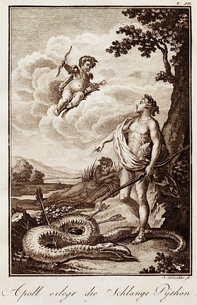 Pyšný Apollón při rozhovoru s malým Erótem (Amor; Cupido) v oblacích. Apollón ukazuje na mrtvého Pýthóna, skoleného šípy, v pozadí leží říční bůh Péneios. Výjev je zasazen do krajiny.