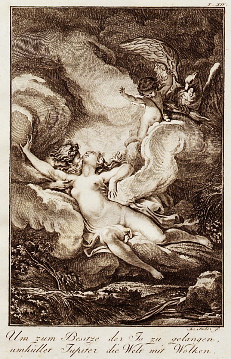 Pod rytinou vysvětlující německý text Um zum Besitze der Io zu gelangen, umhüllet Jupiter die Welt mit Wolken., na pravé straně nahoře označení přílohy T. XIV.