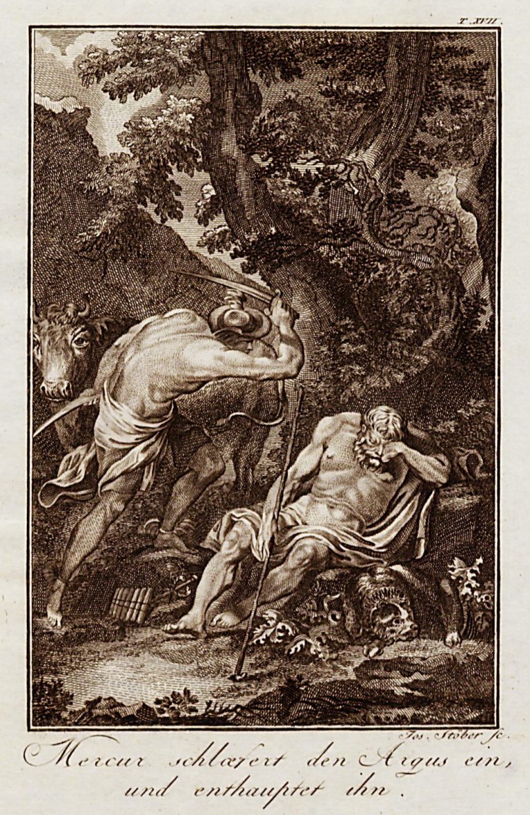 Pod rytinou německý vysvětlující text Mercur schlafert den Argus ein, und enthauptet ihn., vpravo nahoře označení přílohy T. XVII. Rozvržení postav a motiv ilustrace je podobný obrazu Merkur a Argus od Petera Paula Rubense z r. 1635-1638