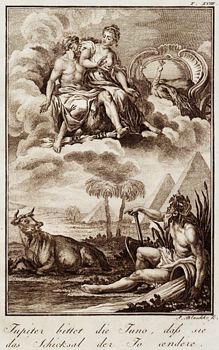 V horní části v oblacích se Zeus (Iuppiter) na orlu a s blesky přimlouvá u Héry (Juno; Iuno) za osud vyhnané Íó. Za Hérou je vůz tažený pávy. Ve spodní části leží Íó v podobě krávy, napravo sedí říční bůh Nilu, v pozadí pyramidy. Íó se stane egyptskou bohyní Ísis.