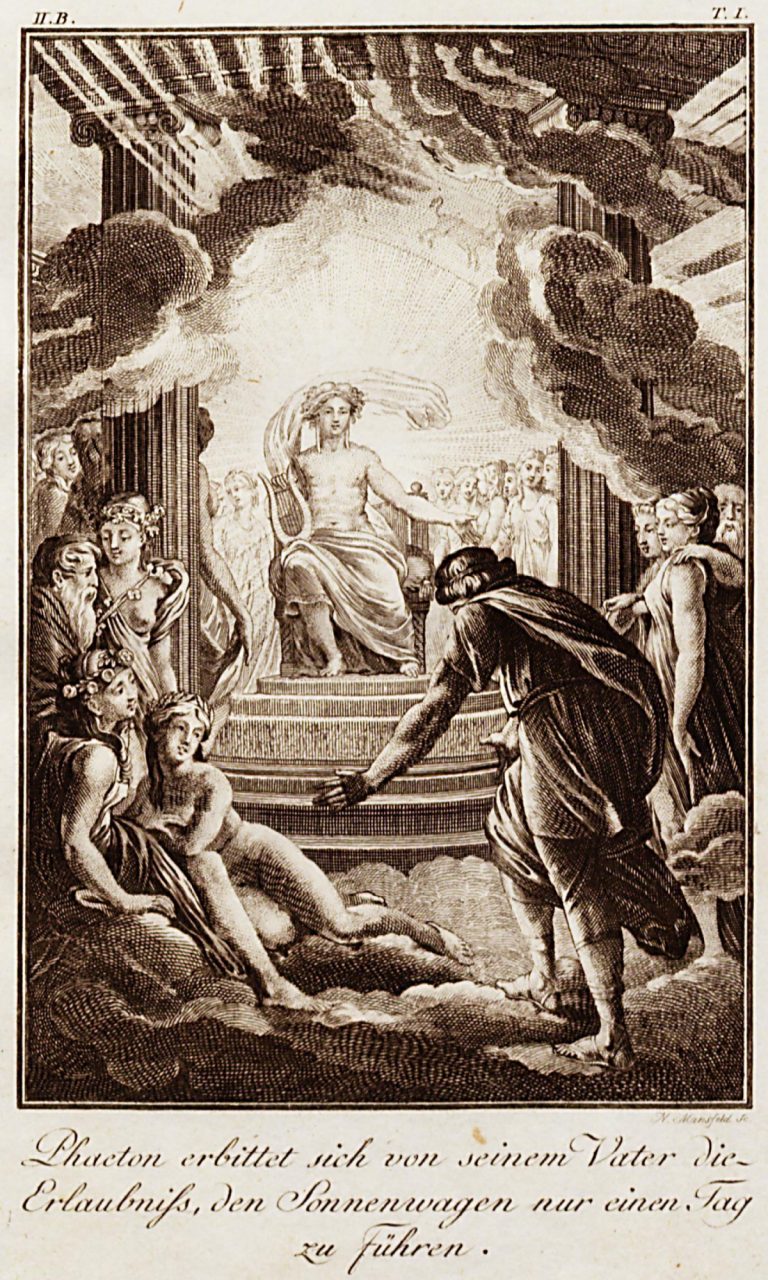 Pod rytinou německý vysvětlující text Phaethon erbittet sich von seinem Vater die Erlaubniss, den Sonnenwagen nur einen Tag zu Führen., v horní části označení přílohy II. B. T. I.