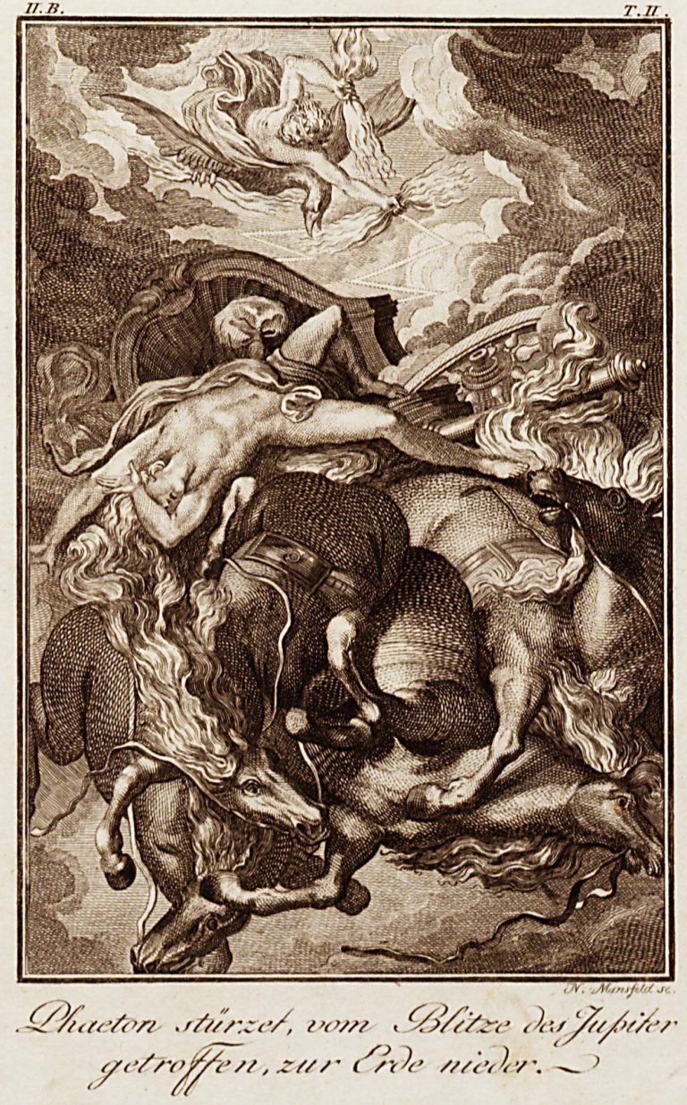 Pod rytinou německý vysvětlující text Phaeton stürzet, vom Blitze des Jupiter getroffen, zur Erde nieder., v horní části označení přílohy II. B. T. II.