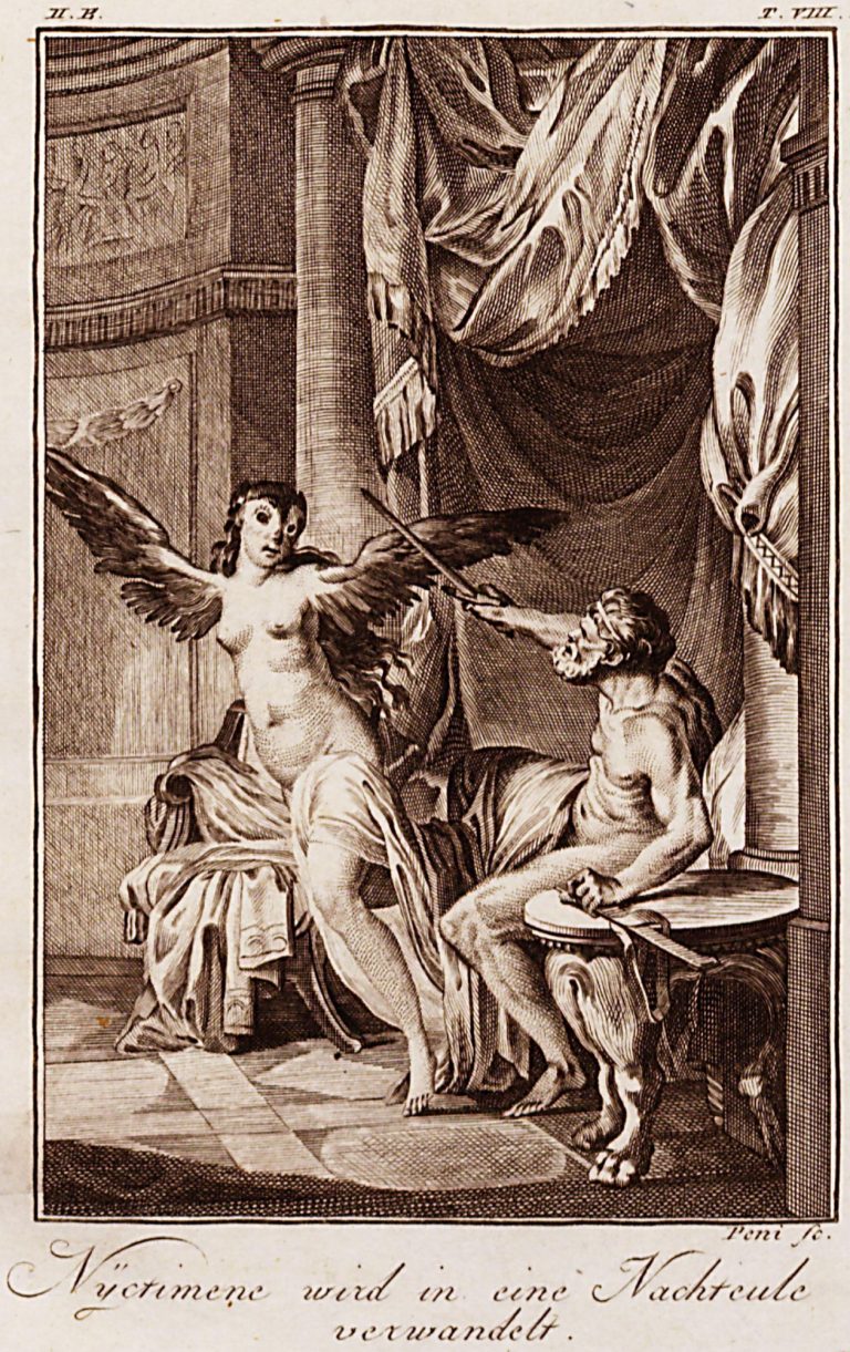 V interiéru ložnice se Nyktimené za trest mění v sovu. Na lůžku polosedí její otec, král Epópeos, s taseným mečem.