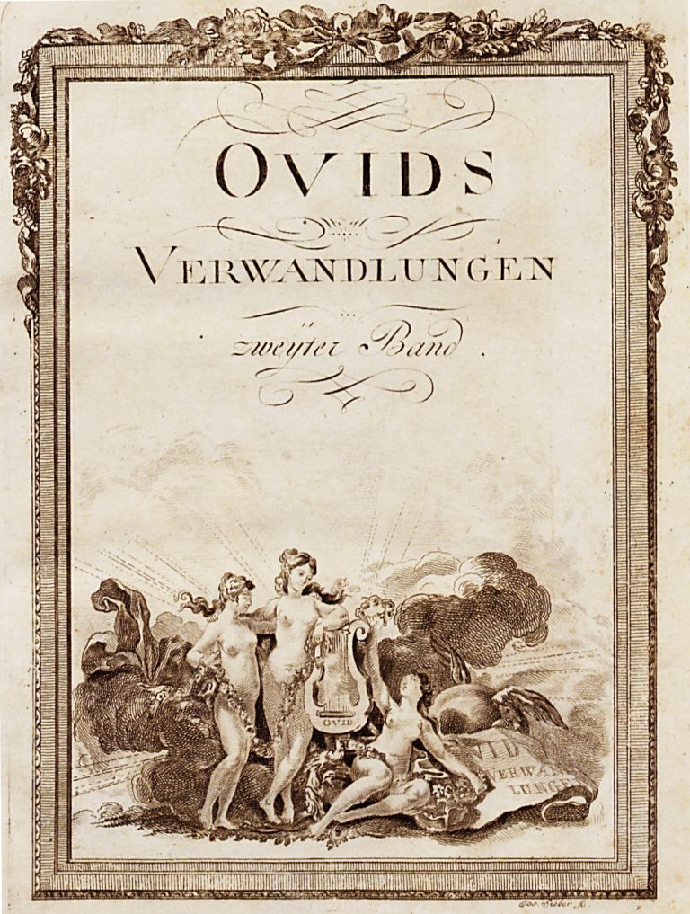V obrazovém orámování ozdobeném stužkou a květinami se nachází věcný název díla a označení svazku OVIDS VERWANDLUNGEN zweyter Band., paprsky slunce za mraky, tři Múzy s lyrou a nápisem OVID, květinovými věnci a květinovým řetězem, pár holubic, látka s věcným názvem díla, křídla a štít.