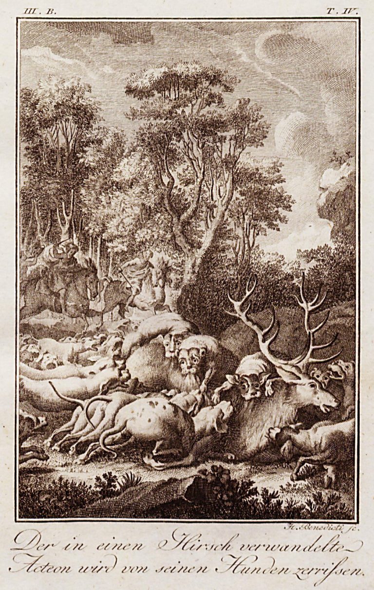Pod rytinou německý text Der in einen Hirsch verwandelte Acteon wird von seinen Hunden zerrissen., v horní části označení svazku a tabulky III. B. T. IV.