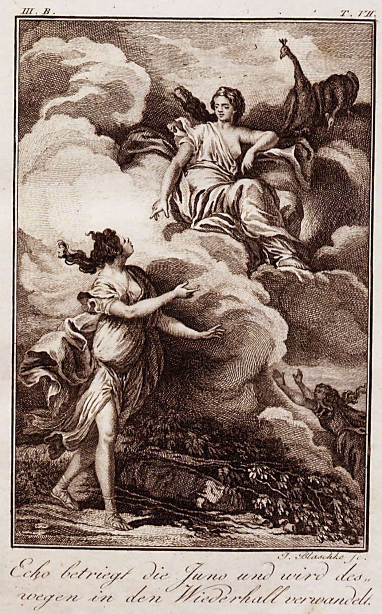 Bohyně Héra (Juno; Iuno) s pávy v oblacích trestá nymfu Échó za povídavost a zdržování proměnou v ozvěnu, v pozadí prchající nymfa.