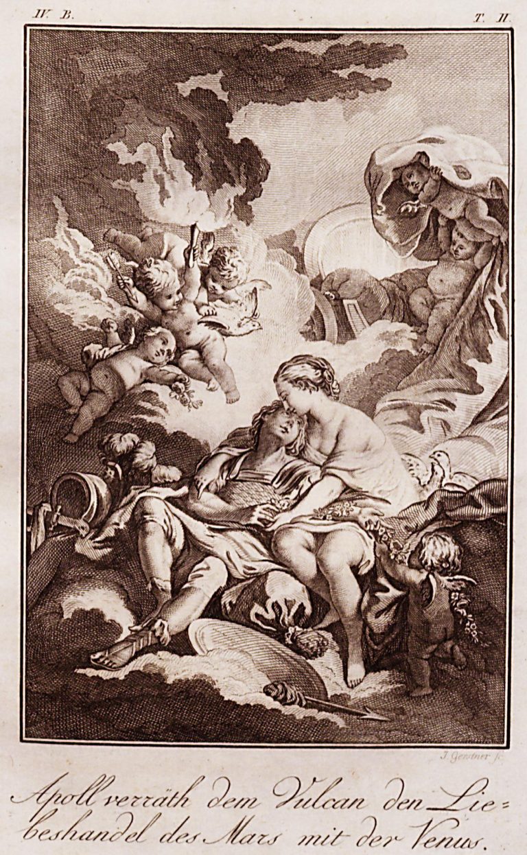 Pod rytinou německý text Apoll verräth dem Vulcan den Liebeshandel des Mars mit der Venus., nahoře označení IV. B. T. II.