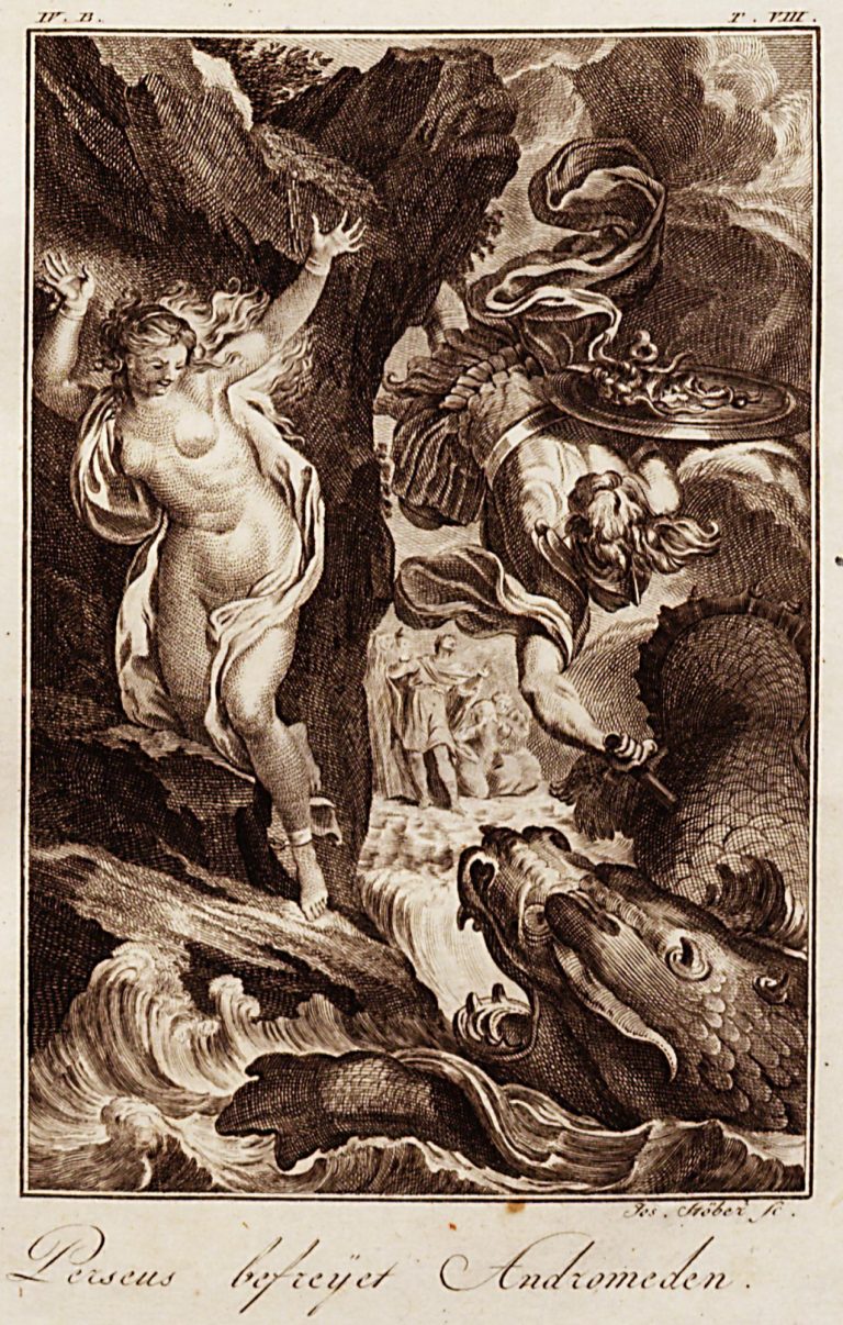 Pod rytinou německý text Perseus befreyet Andromeden., nahoře označení IV. B. T. VIII.