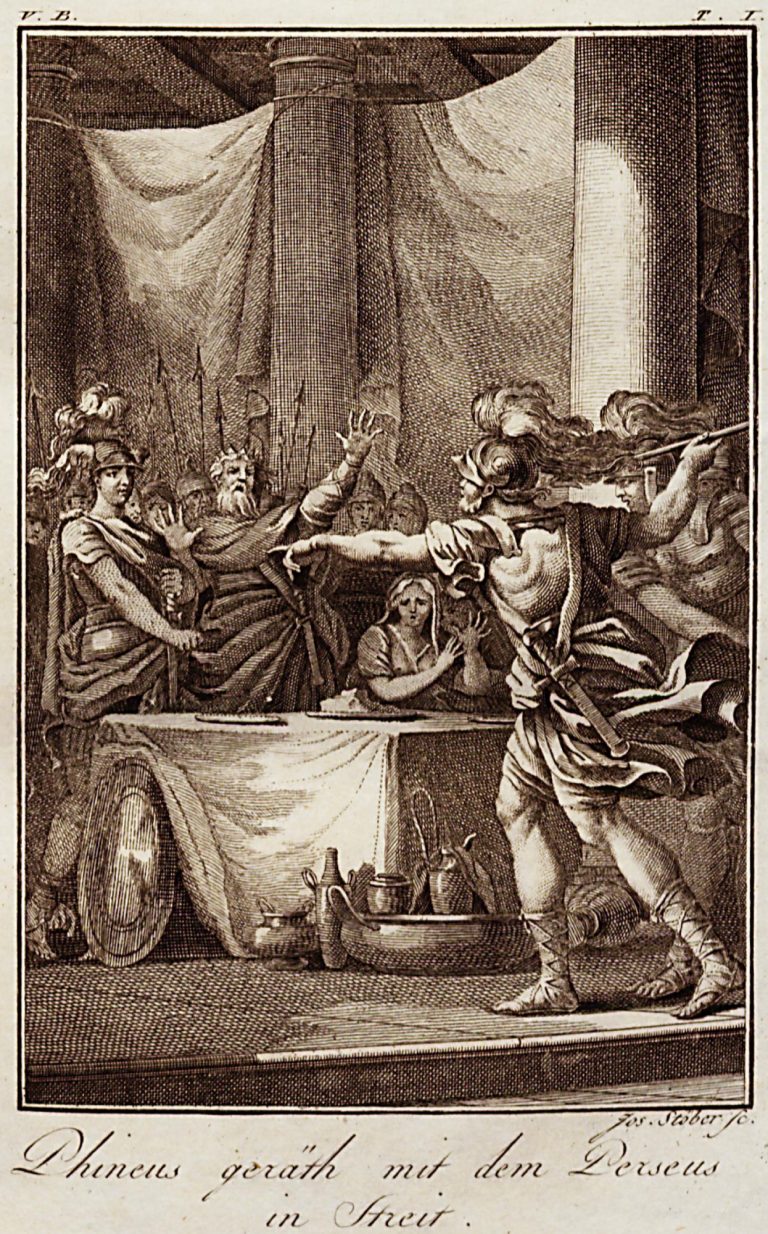 Pod rytinou německý text Phineus geräth mit dem Perseus in Streit, nad rytinou označení V. B. T. I.