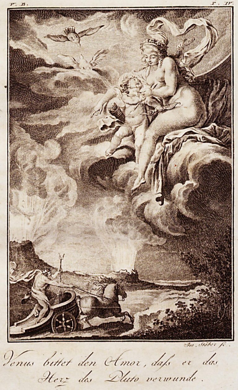 Pod rytinou německý text Venus bittet den Amor, dass er das Herz des Pluto verwunde., nad rytinou označení V. B. T. IV.