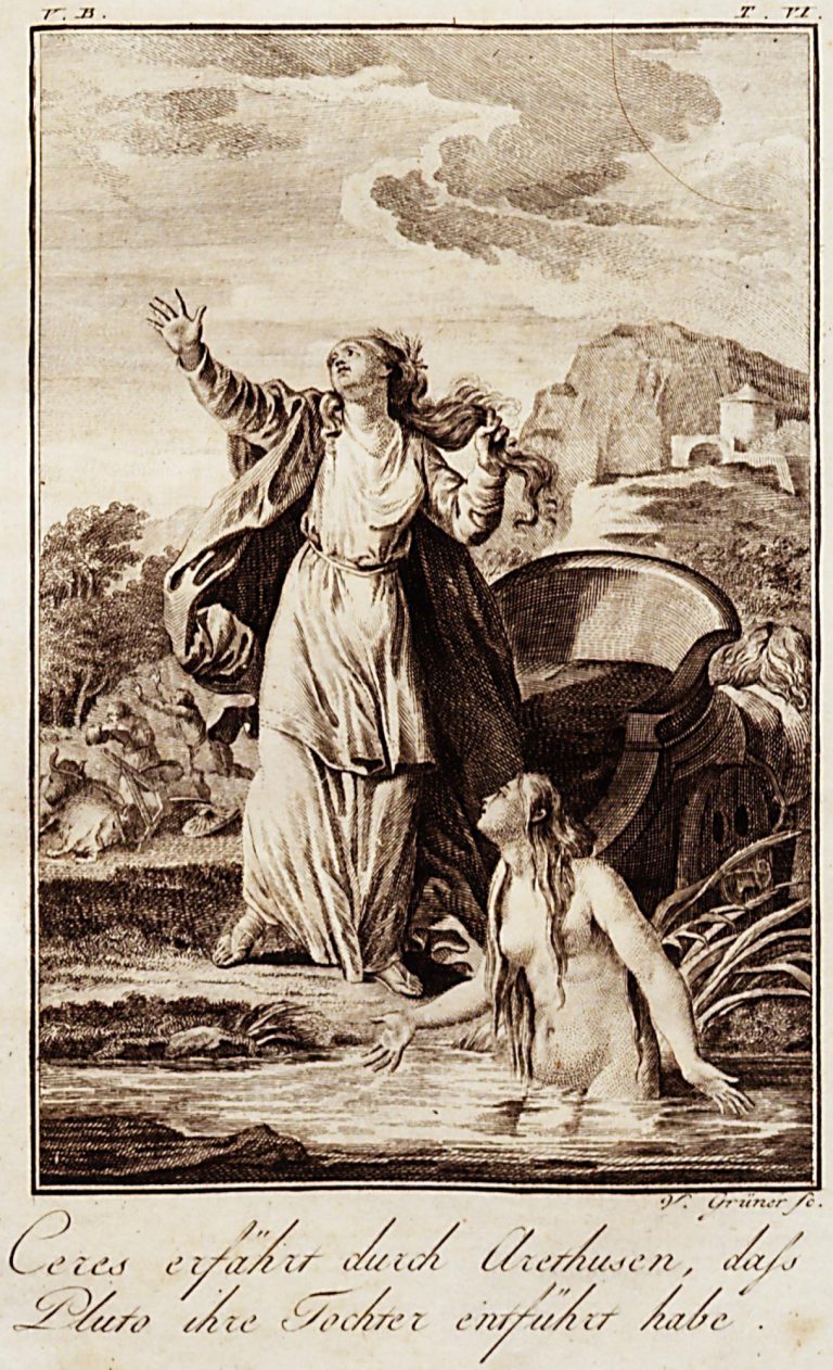 Pod rytinou německý text Ceres erfährt durch Arethusen, dass Pluto ihre Tochter eintführt habe., nad rytinou označení V. B. T. VI.