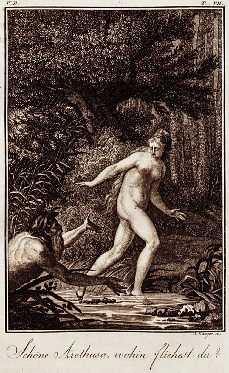 Nymfa Arethúsa prchá skrze mělkou říčku a otáčí se k pronásledovateli. Alfeios k ní vztahuje paže. Výjev je zasazen do lesní krajiny. Arethúsa se promění v říční proud.