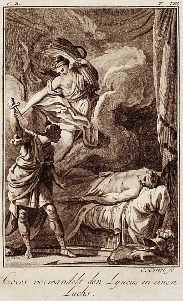 Pod rytinou německý text Ceres verwandelt den Lyncus in einen Luchs., pod rytinou označení VI. B. T. VIII.