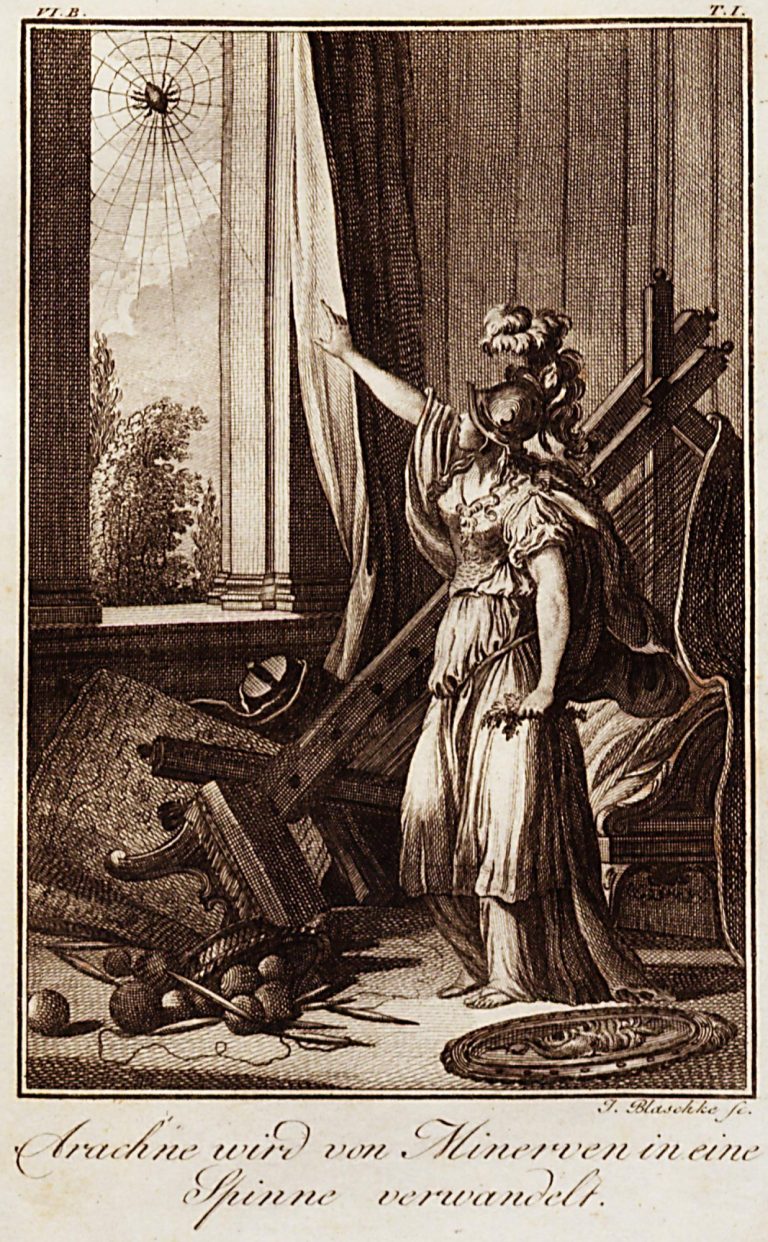 Pod rytinou německý text Arachne wird von Minerven in eine Spinne verwandelt., v horní části označení VI. B. T. I.