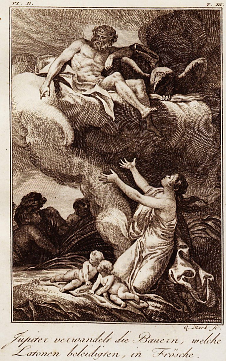 Létó (Látó; Latona) s malými dětmi Apollónem a Artemis (Diana) prosí Dia (Iuppiter) na oblacích o potrestání Lýčanů – rybářů, kteří jí odepřeli osvěžení u rybníka. Zeus Lýčany proměňuje v žáby, u sebe má své posvátné zvíře – orla s blesky.