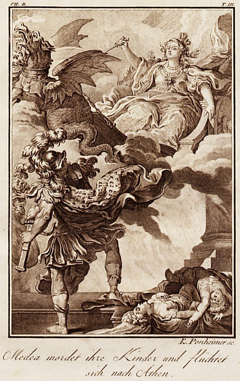 Pod rytinou německý text Medea mordet ihre Kinder und flüchtet sich nach Athen., nad rytinou označení VII. B. T. III.