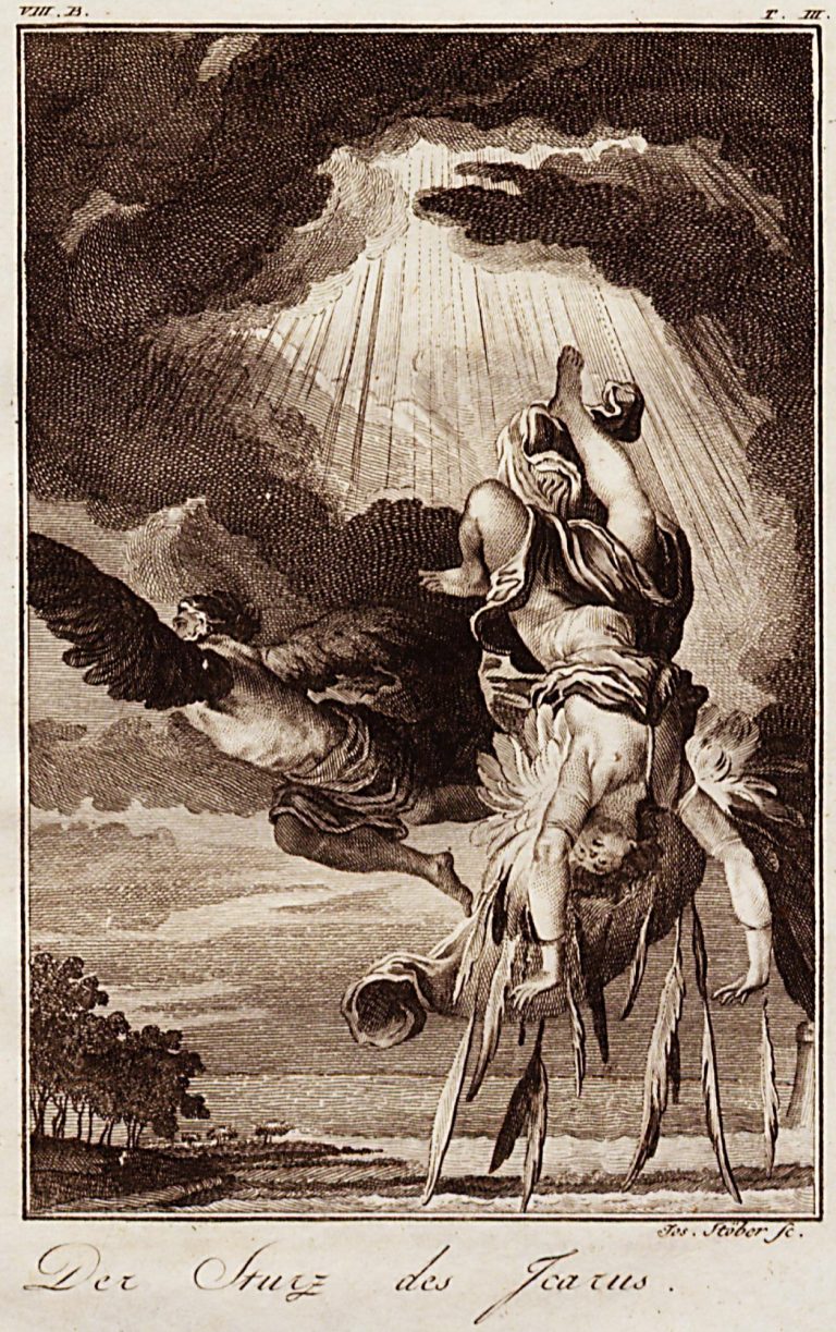 Pod rytinou německý nápis Der Sturz des Icarus., nad rytinou označení VIII. B. T. III.