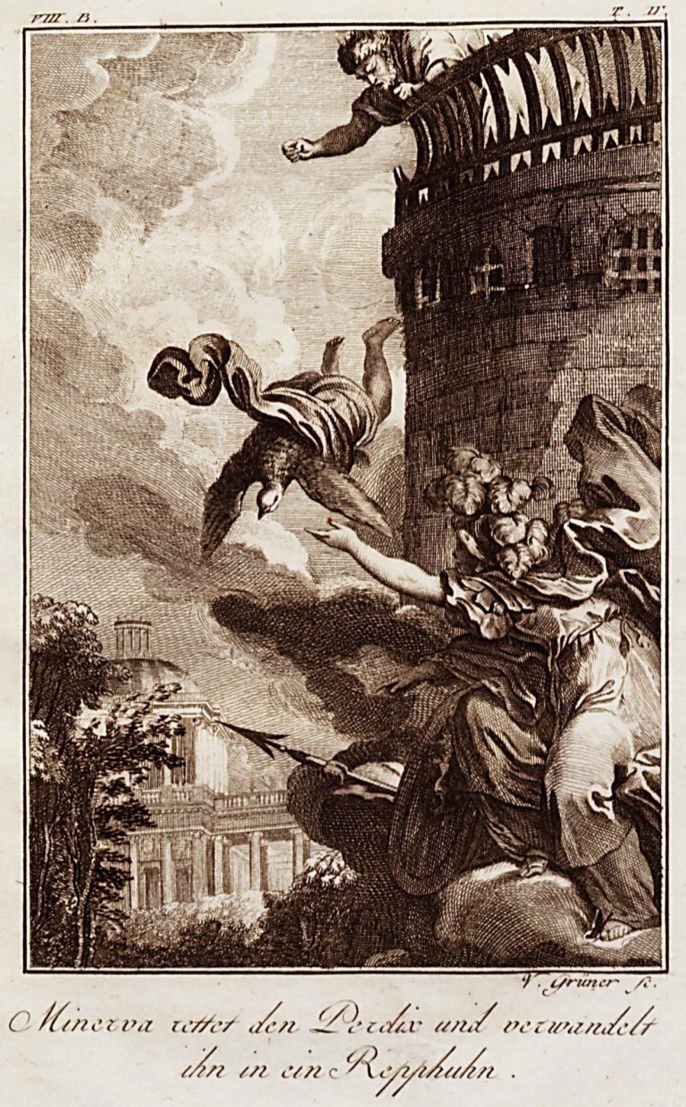 Athéna (Minerva) proměňuje padajícího Perdíka (Talós) v koroptev (čejku). Daidalos (Daedalus), který ze žárlivosti shodil svého nadaného synovce Perdíka, se naklání z athénských hradeb.