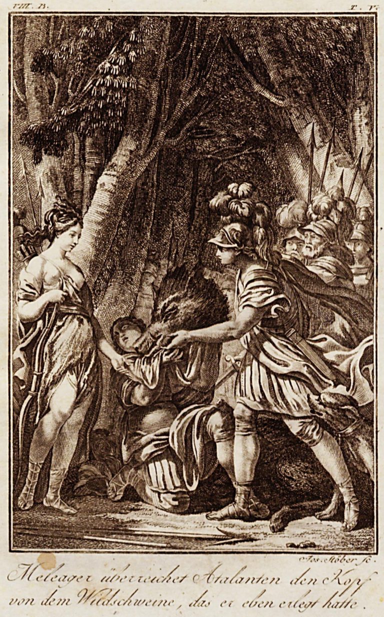 Pod rytinou německý nápis Meleager überreichet Atalanten den Kopf von dem Wildschweine, das er eben erlegt hatte., nad rytinou označení VIII. B. T. V.