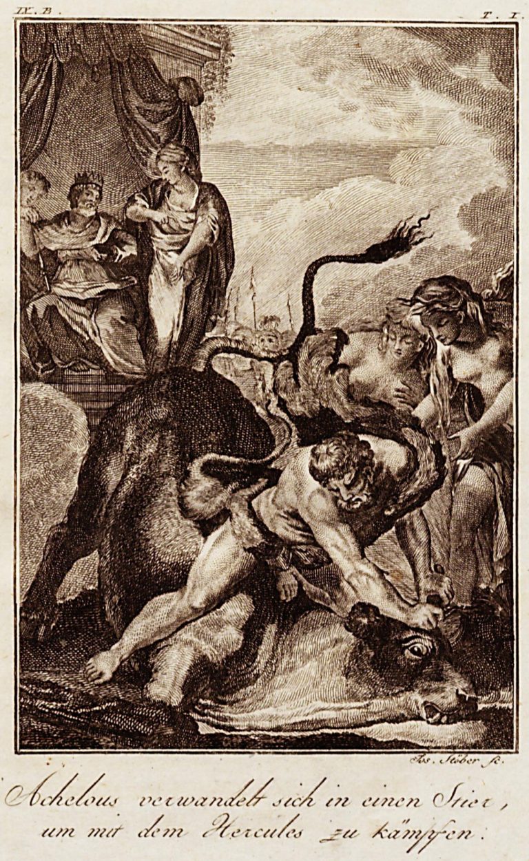 Pod rytinou německý text Achelous verwandelt sich in eine Stier, um mit dem Hercules zu kämpfen., nad rytinou označení IX. B. T. I.
