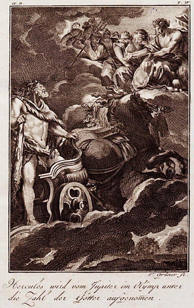 Pod rytinou německý text Hercules wird vom Jupiter im Olymp unter die Zahl der Götter aufgenomen., nad rytinou označení IX. B. T. IV.