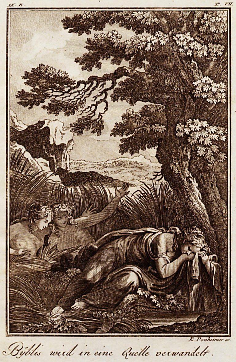 Plačící Byblis, nešťastně zamilovaná do svého bratra Kauna, leží pod listnatým stromem a mění se v pramen, pozorují ji dvě nymfy.
