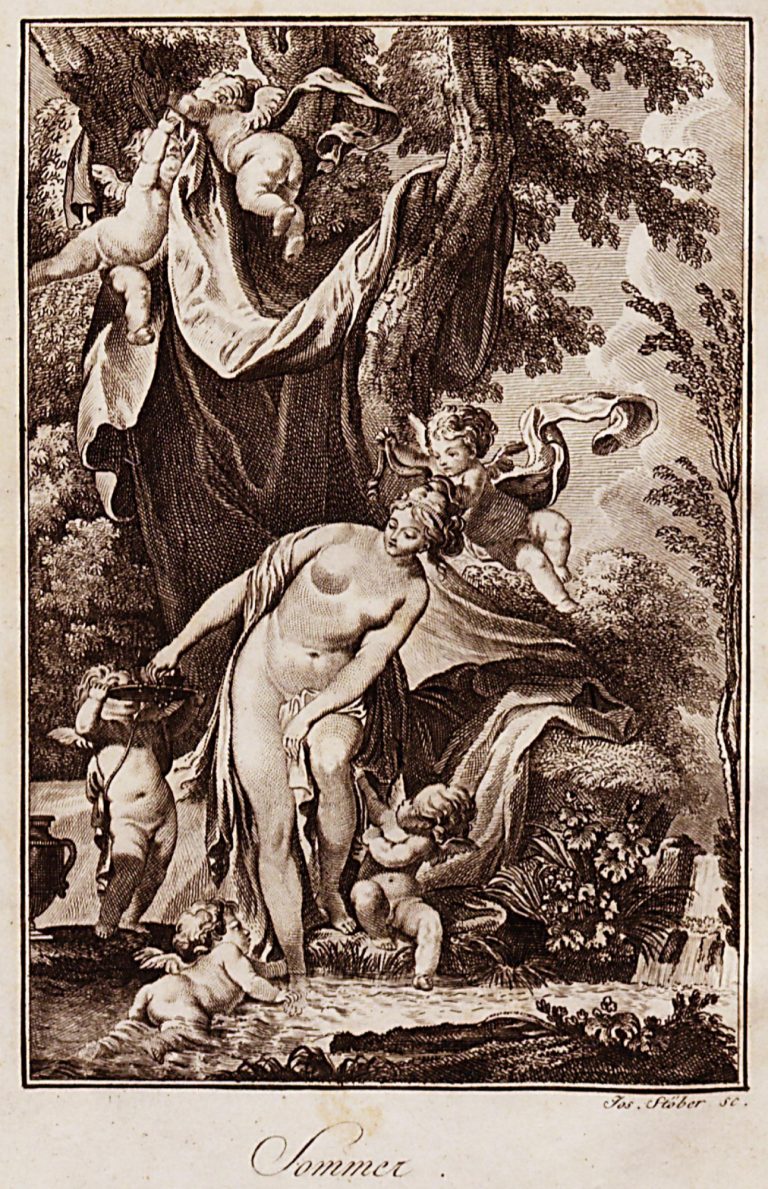 Alegorie léta – u vzrostlého listnatého stromu mladá žena vstupuje do říčky v letní krajině obklopená okřídlenými putti. Po levé straně jeden puttó drží tác se šperky, po pravé straně jiný upravuje ženě účes, další asistuje u vody, ostatní přidržují látku, do které je oděná, nebo baldachýn nad ní.