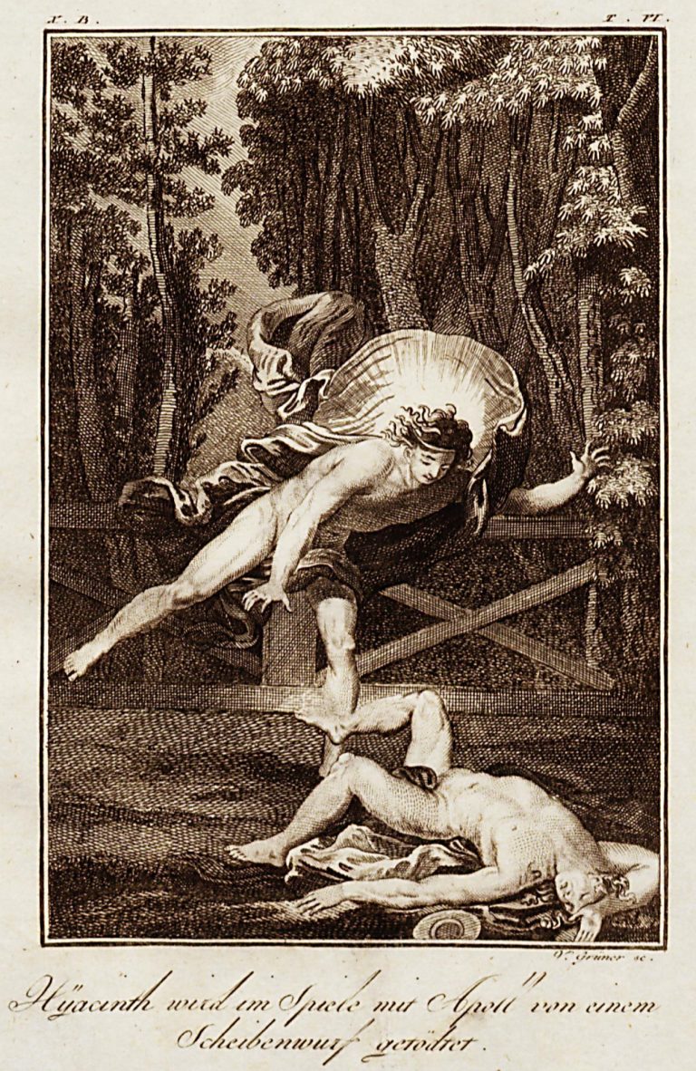 Pod rytinou německý text Hyacinth wird im Spiele mit Apoll von einem Scheibenwurf getödtet., nad rytinou označení X. B. T. VI.