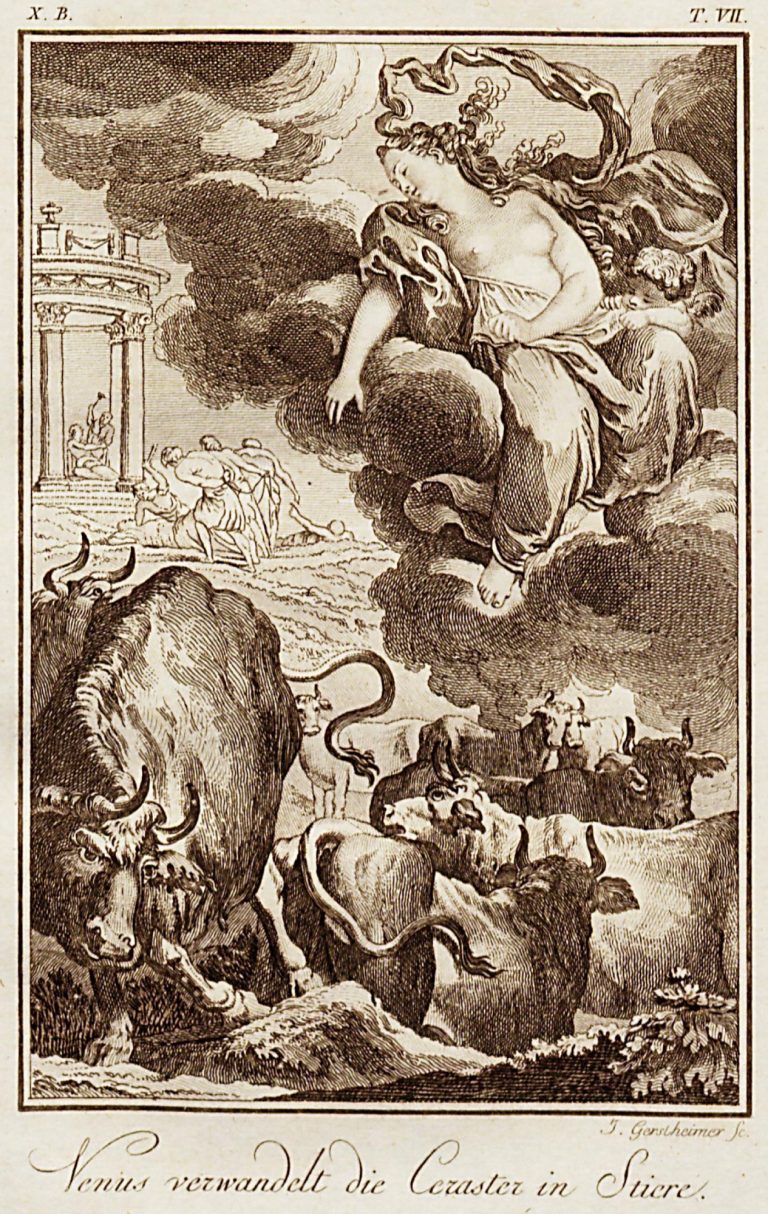 Pod rytinou německý text Venus verwandelt die Ceraster in Stiere., nad rytinou označení X. B. T. VII.