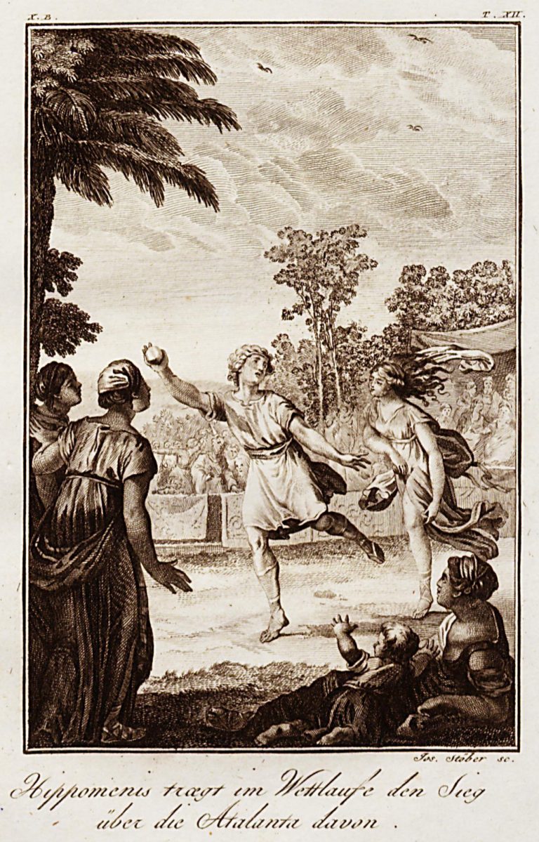 Pod rytinou německý text Hippomenis tragt im Wettlaufe den Sieg über die Atalanta davon., nad rytinou označení X. B. T. XII.