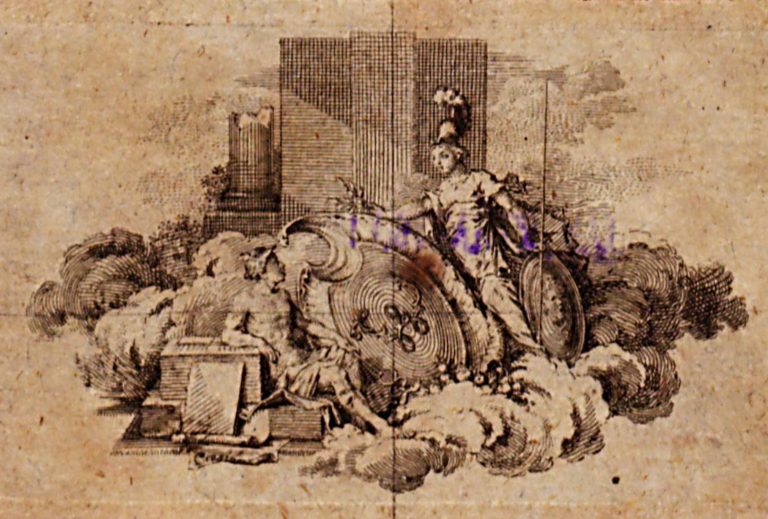 Štít v oblacích mezi sedícím Hermem (Merkur; Mercurius) a stojící Athénou (Minerva), která drží vavřínové větévky, knihy a svitky, zbytky antického sloupoví.