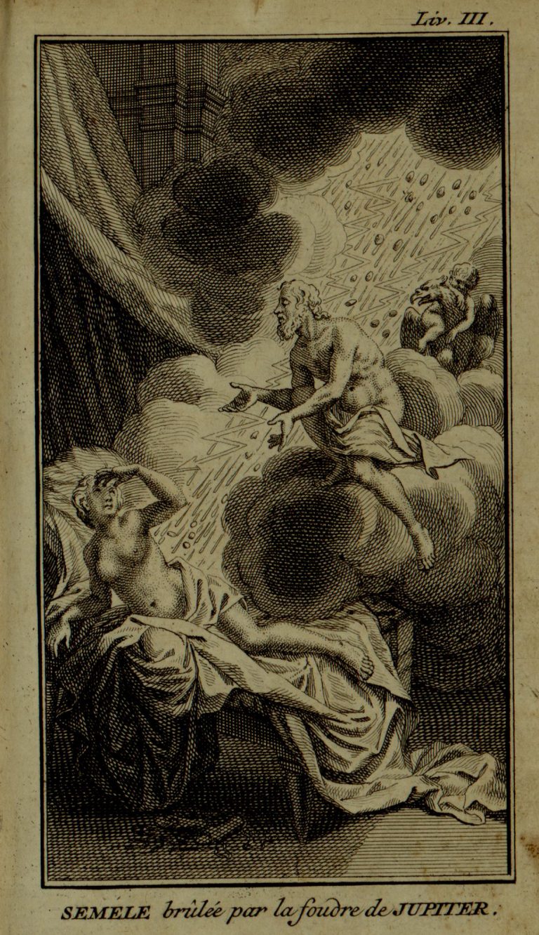 V dvojrámečku, v horní části označení Liv. III., pod rámečkem francouzský text SEMELE brulée par la foundre de JUPITER.