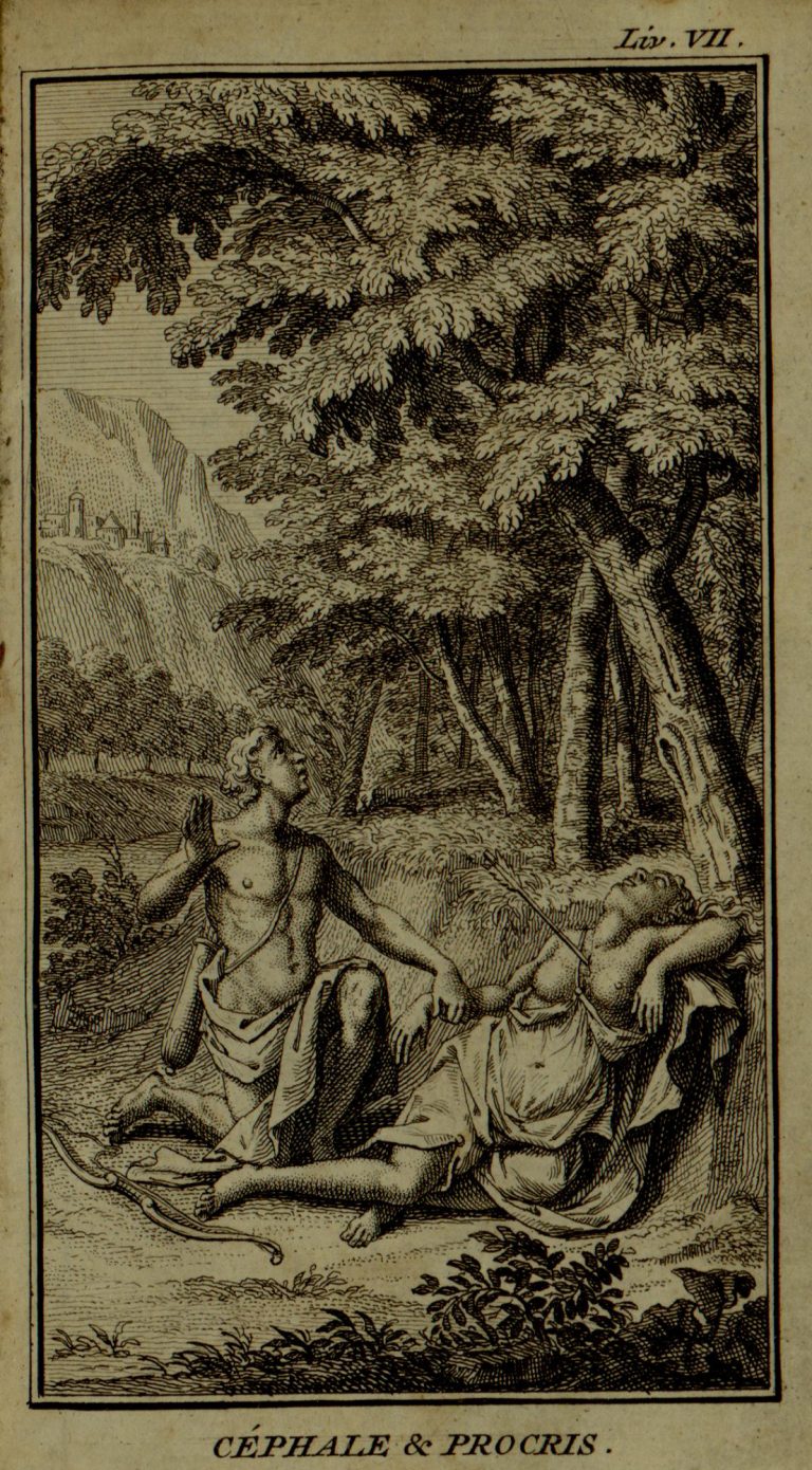 Klečící Kefalos (Cephalus) nad umírající Prokridou s šípem v hrudi (Kefalos svou manželku nevědomky střelil, považoval ji za zvěř). Výjev je zasazen v krajině na okraji listnatého lesa. V pozadí skály a stavby.