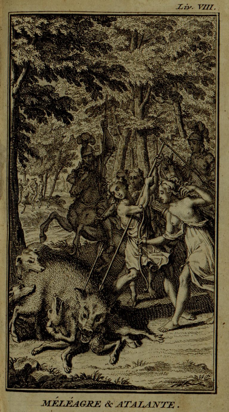 V dvojrámečku, v horní části označení Liv. VIII., pod rámečkem francouzský text MÉLÉAGRE & ATALANTE.
