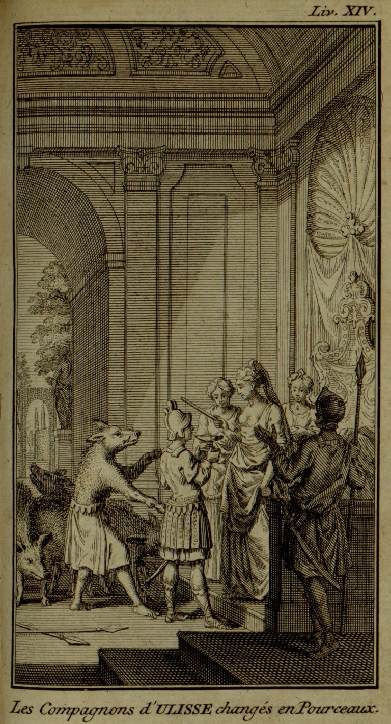 V dvojrámečku, v horní části označení Liv. XIV., pod rámečkem francouzský text Les Compagnons d’ULLISSE changés en Pourceaux.